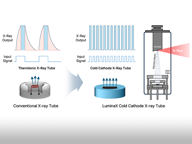We've been developing CNT-based cold cathode X-ray tube technology to replace conventional hot cathode X-ray tubes and enable next-generation X-ray systems. This innovative techonology offers low radiation exposure, low heat generation, and precise dose control.